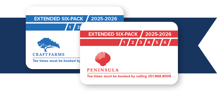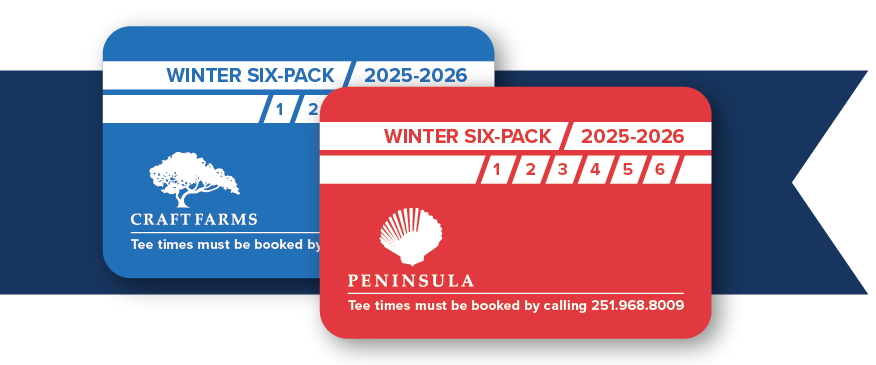 Both Craft Farms and Peninsula are offering Six-Pack Cards this year! This popular program offers golfers visiting the greater Gulf Shores area the ability to buy six rounds at either of our clubs for a significant savings. You can choose between two options for 2025-2026, and you can start using your rounds as early as November 15th!